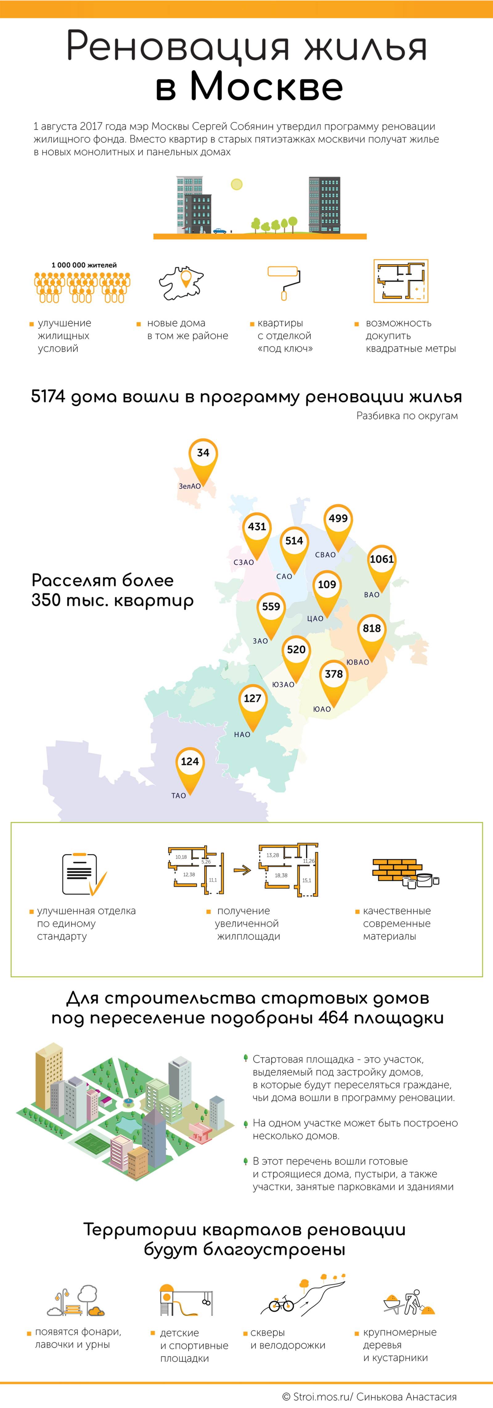 Напомним, мэр Москвы Сергей Собянин 1 августа 2017 года утвердил программу реновации жилищного фонда. Она предусматривает расселение более 350 тыс. квартир. В программу включено 5174 дома.