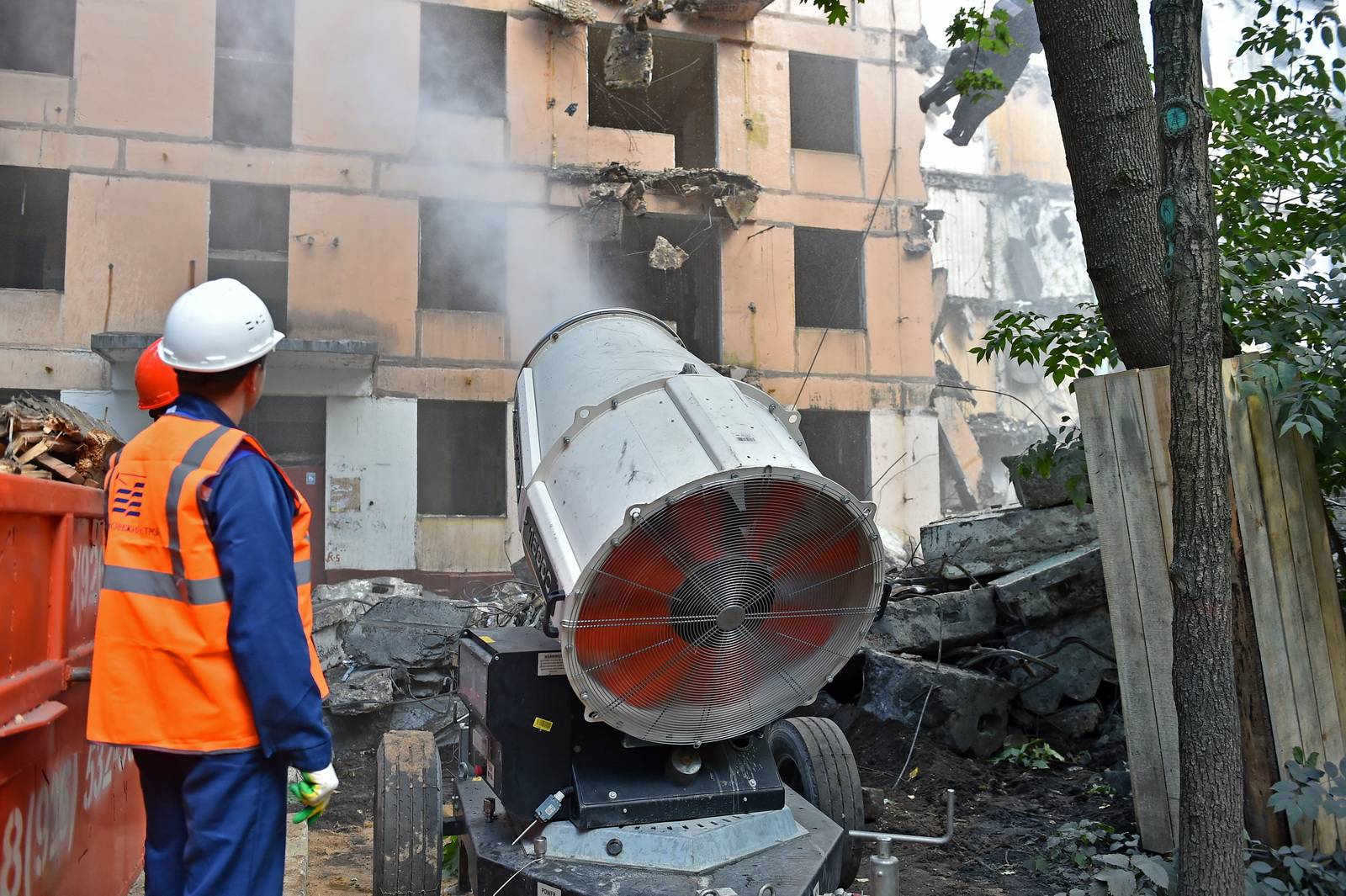 2. Для борьбы с пылью применяются гидропушки, подающие воду под большим давлением. Они направляют водяное облако в конкретное и необходимое место. При сносе они сразу обрабатывают большую территорию – до 20 тыс. кв. метров за час. Благодаря этому на площадке образуется меньше грязи.