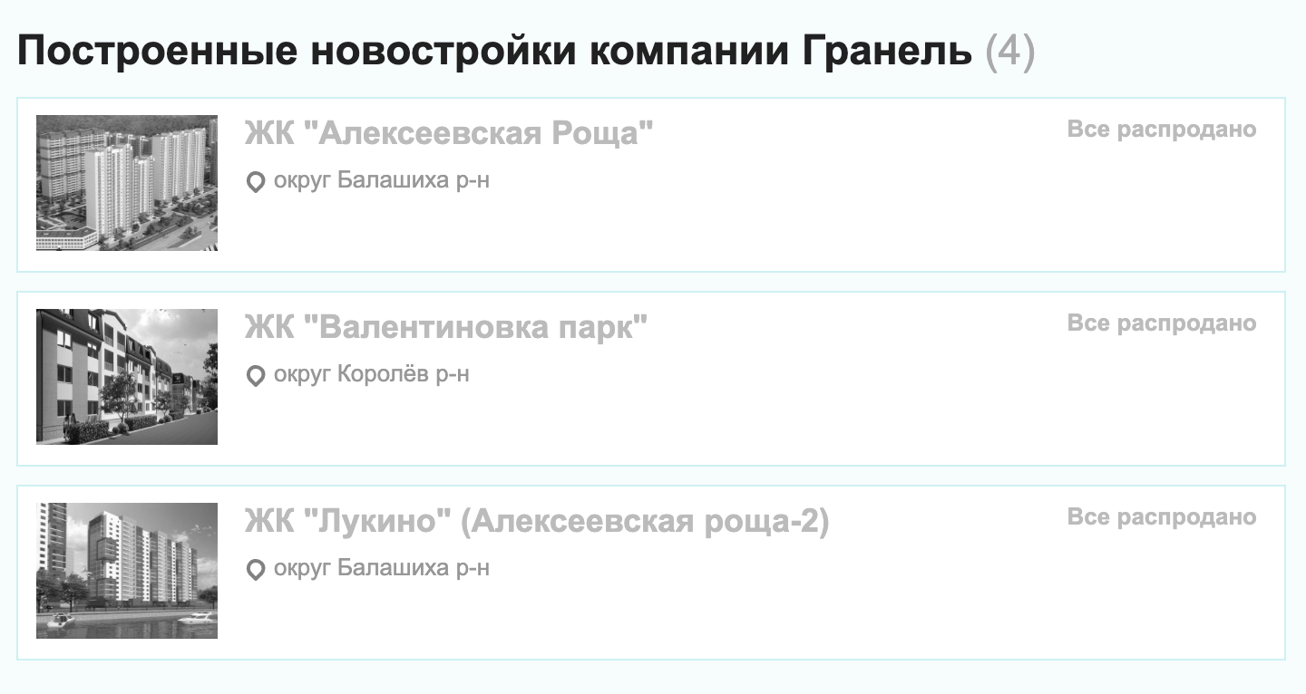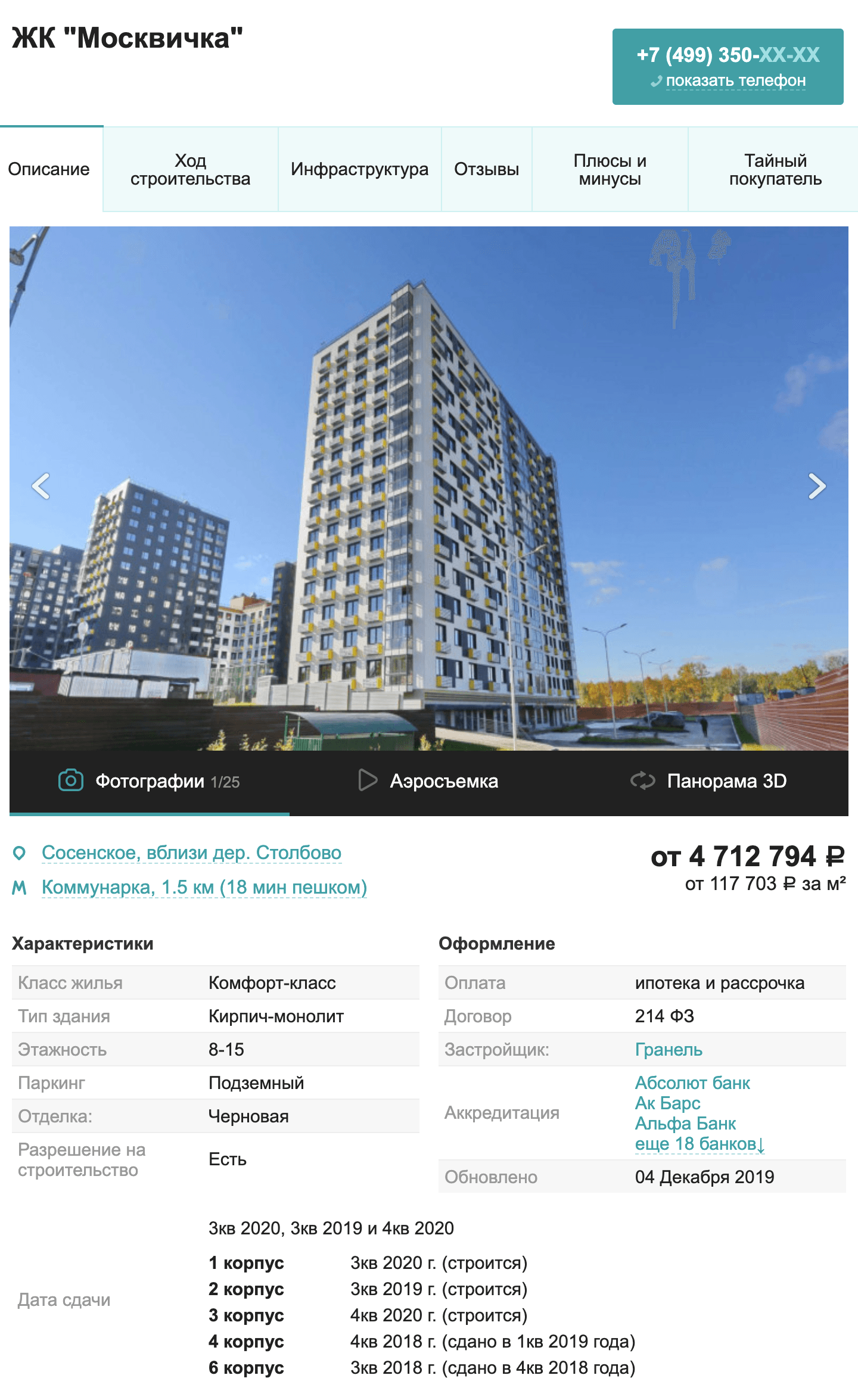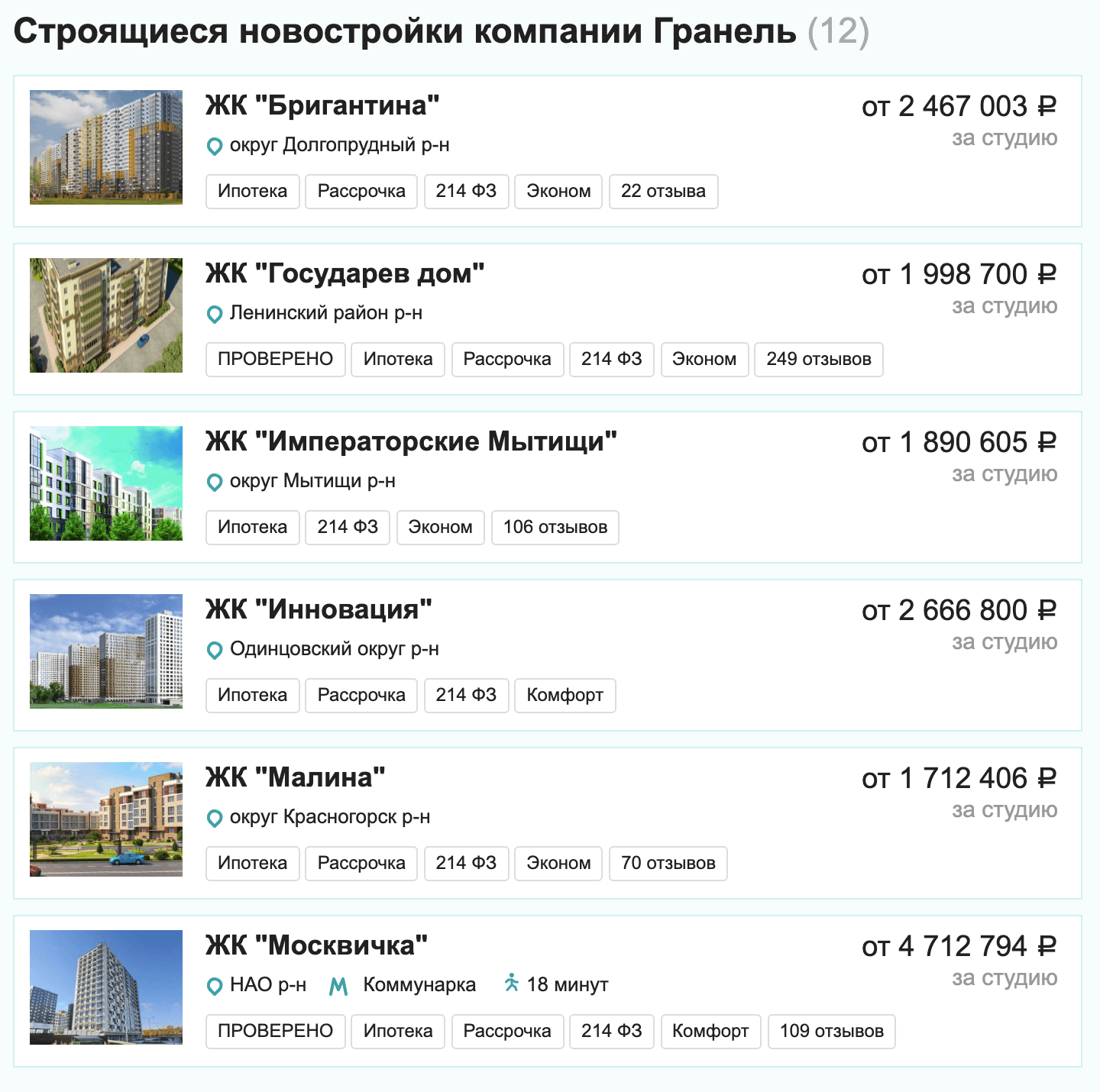 На сайте интересующую новостройку можно найти в поиске или на карте. Кроме основных характеристик новостройки там всегда есть ссылка на застройщика с краткой информацией о компании, датой ее создания и списком строящихся и уже построенных объектов. Я предпочитаю смотреть подобную информацию на справочных сайтах, а не на сайте застройщика, чтобы она была максимально объективна.