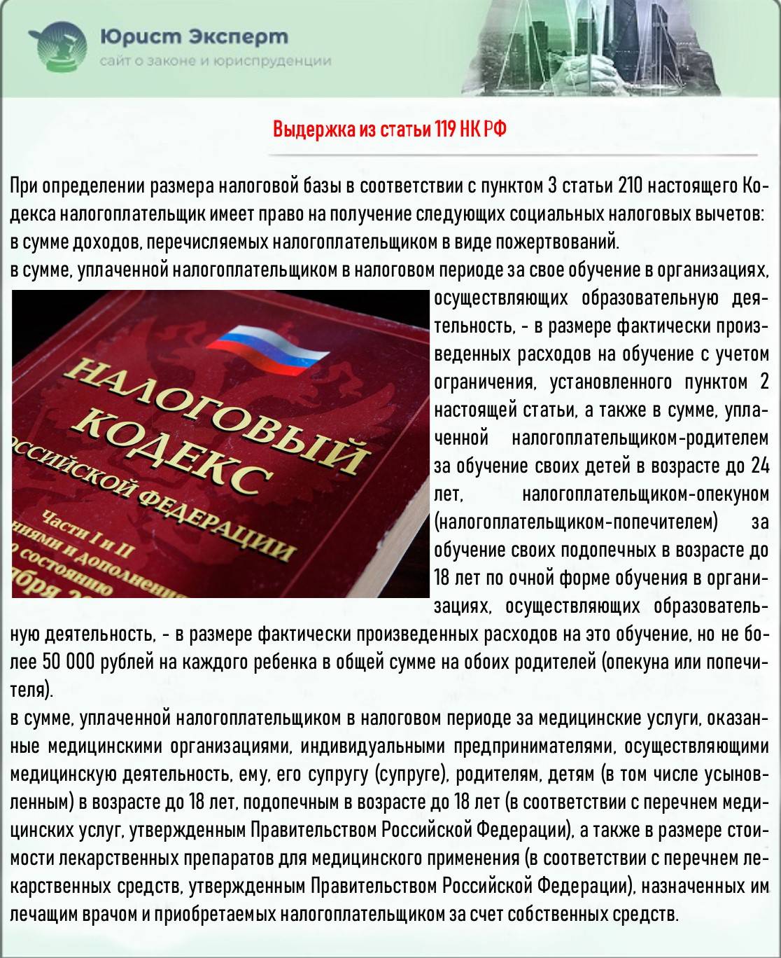 Если гражданин проходил учёбу или лечение, то он имеет право вернуть определённую сумму из потраченных средств. Максимальный размер вычета — не более 120 тыс. рублей.