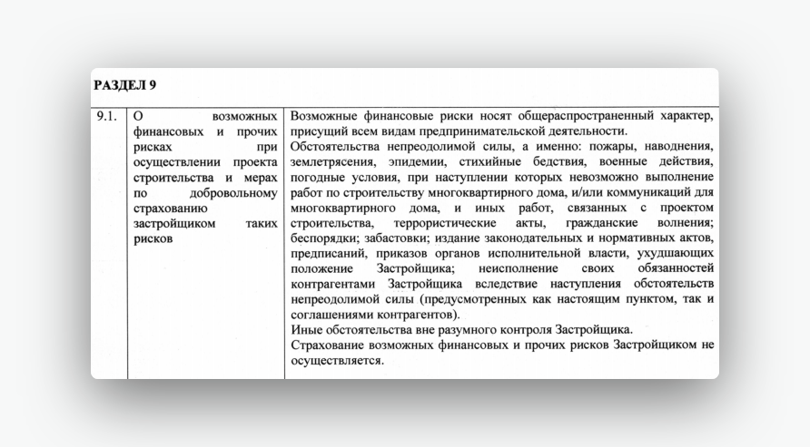 Отдельно перепроверьте в проектной декларации источники финансирования строительства. Если в разделе «Финансовые риски» написано что-то вроде «строительство осуществляется за счет заемных банковских средств», это отличный знак. Если стройку финансирует крупный банк, то он за вас уже перепроверил застройщика, потому что тоже рискует своими деньгами.
