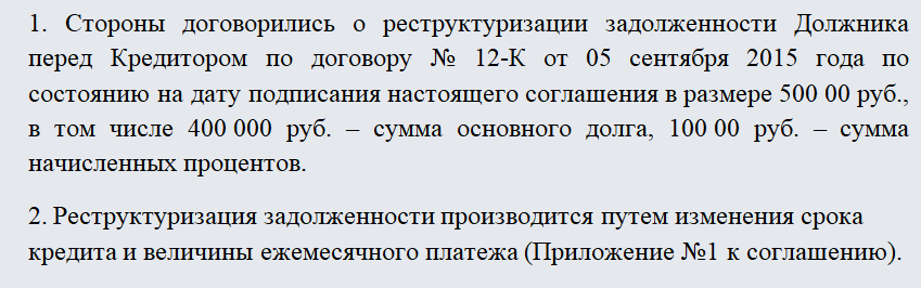 Чтобы изменить порядок погашения долга, между двумя сторонами заключается сделка. Опираясь на имеющийся документ, стороны должны прийти к единому решению касательно размеров и варианта выплаты конкретных сумм.