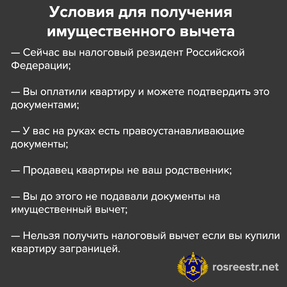 Право на оформление таким способом налогового вычета имеет также каждый супруг независимо от того, вписан он в качестве собственника жилья, или нет. Главное, чтобы недвижимость была приобретена в собственности, а брачный договор не предусматривал иного деления имущества между супругами.
